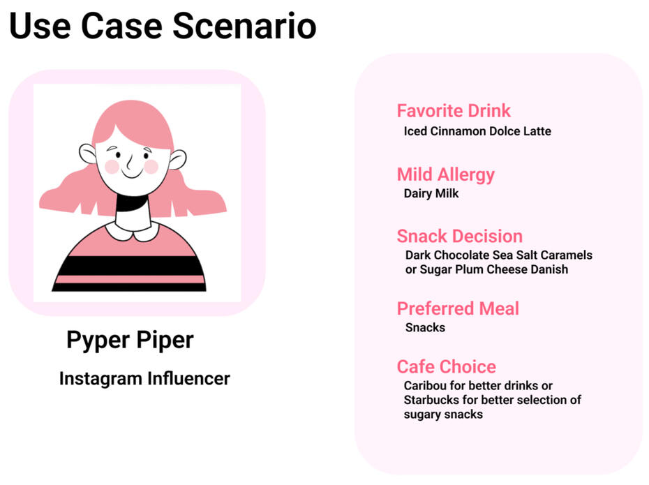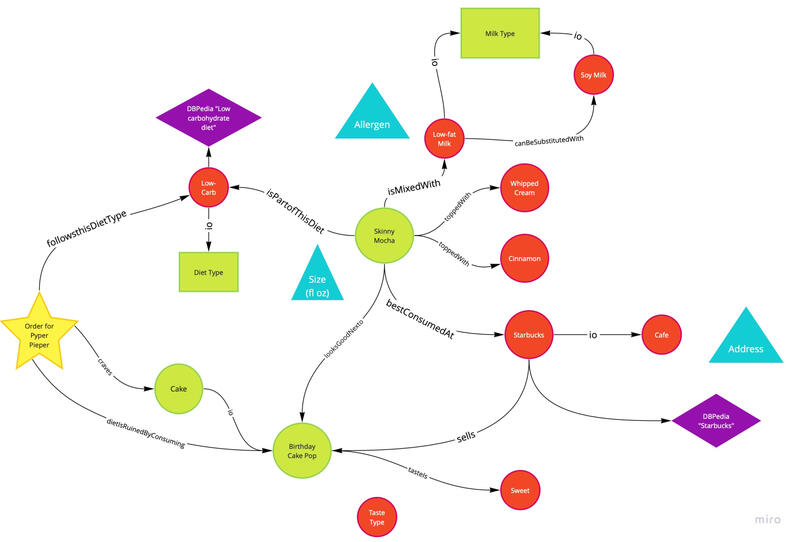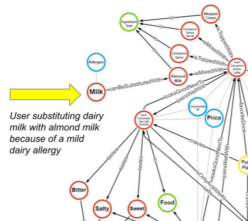 A knowledge graph shows the relationships of interlinked entities that develop further insight or knowledge on the data given. In our use case scenario, Pyper Pieper is an Instagram influencer and is ending her week with a given choice of a cheat day as she has been on a strict low-carb diet throughout the week. We visually displayed relationships between Pyper Piper, her situation, objects, concepts, and events using a knowledge graph.In exploring the scenario we discovered optimal ways to implement the relationships between our user, her needs and restrictions. Her favorite drink is the iced cinnamon dolce latte from Starbucks, a concept from the Cafe domain in the taxonomy. We utilized the “favoriteDrink” relationship in the ontology to link the two together. She usually replaces the dairy milk with an alternative milk because of a mild dairy allergy. We implemented the allergen attribute from the ontology to understand why she is making the substitution of dairy milk with almond milk.Each of her possible decisions and motivations helped build our ontological relationships and the knowledge graph to represent these relationships. Pyper Piper’s scenario is one example of a single user's decision-making process. But through that we have access to a host of our other classes and provides us the ability to expand and enhance current and future users' experiences.