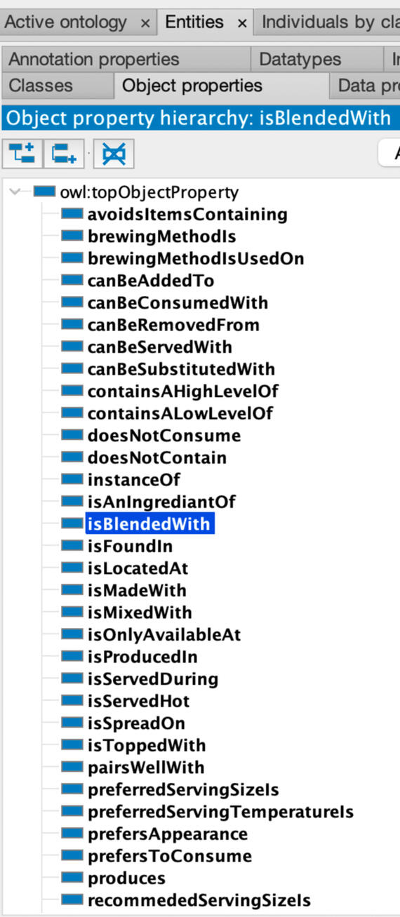 Building off our taxonomy, our ontology goes one step further in showing more relationships in a non-hierarchical setting. We realized we needed to add more classes to better understand our use scenario so we added new classes to our taxonomy such as “Meal Type” and “Diet Type” to show more relationships. When building out our relationships we needed to think about our user journey. What would our users care about? In a spreadsheet we wrote down various relationship terms which needed to relate to at least one other class in our taxonomy. To help describe how a user may search for an item we created the relationship “isServedDuring” to pair, for example “bagel” with “breakfast”. We want our optimized cafe menu app to recommend items based on a variety of variables such as the meal and diet types. Another relationship we included was ingredient types of various food and drinks.Building out our attributes we again thought about our use case and what information would be useful to not only the app user but also the administrator. Some would obviously be more beneficial to the user such as “Address”, “Allergen”, and “Phone Number” but others could serve both the user and the administrator like “Price” and “Order Number”. We then created a custom schema with specific limits on the domain and range for each class. We knew it wouldn’t be efficient to always include the relationship “isServedDuring” for every class so we only permitted that relationship to occur in our domain of “Consumables” and our range “Meal”.