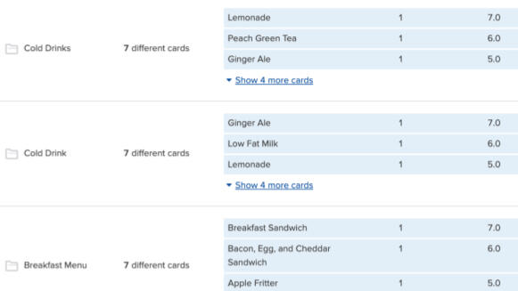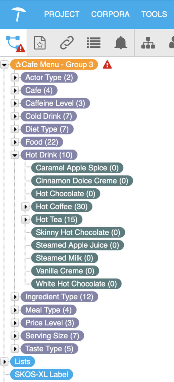 We constructed our cafe menu taxonomy in PoolParty. Our approach was to create a taxonomy that referenced cafes that people were familiar with and around us. We used Starbucks as the primary resource as it was one of the few cafes that included detailed nutritional facts. To expand the concept terms in our taxonomy, we reviewed other cafe menus such as Caribou Coffee, Dunkin Donuts, and Peet's Coffee. The first level concept terms included cold drinks, food, hot drinks, ingredient type, and diet type. In addition to expanding our taxonomy, we used corpus analysis in PoolParty to help us extract more concept terms from all the cafe menus. We pulled data from a Kaggle dataset that included every Starbucks menu item to provide us with additional candidate terms for our taxonomy. We also ran a web crawl on various menus from the official websites of Starbucks, Caribou Coffee, Peet’s Coffee, Coffee Bean, Einstein Bagels, and the DBpedia entry for “low-carbohydrate diet”.
