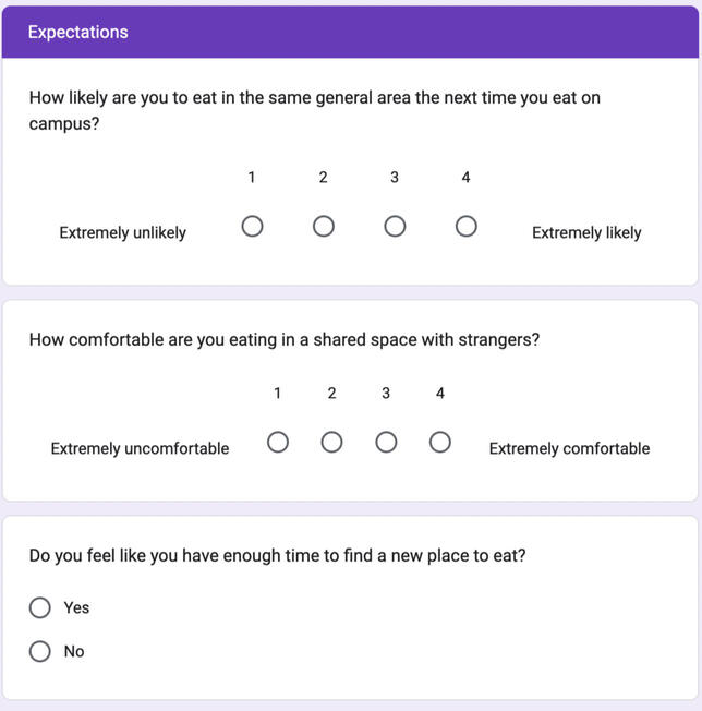 Process: We first created a list of stakeholders affected by eating on campus. We then built a system diagram and identified 5 individuals to conduct contextual inquiries on. Afterwards we sent out a Qualtrics survey to 20 additional stakeholders to better understand comfort dimensions in a public eating space. We then built a prototype, performed a Wizard of Oz usability test, then iterated on the design.
